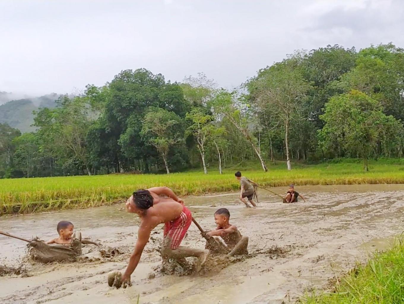 Kebut lumpur ini bermula dari pekerjaan menarik tanah di sawah dengan pelepah pohon pinang. Seterusnya oleh anak-anak di desa untuk menarik temannya. Keseruan permainan menarik temannya ini sehingga pada acara Gawai padi, HUT RI dan moment tertentu, permainan Kebut lumpur ini di mainkan.