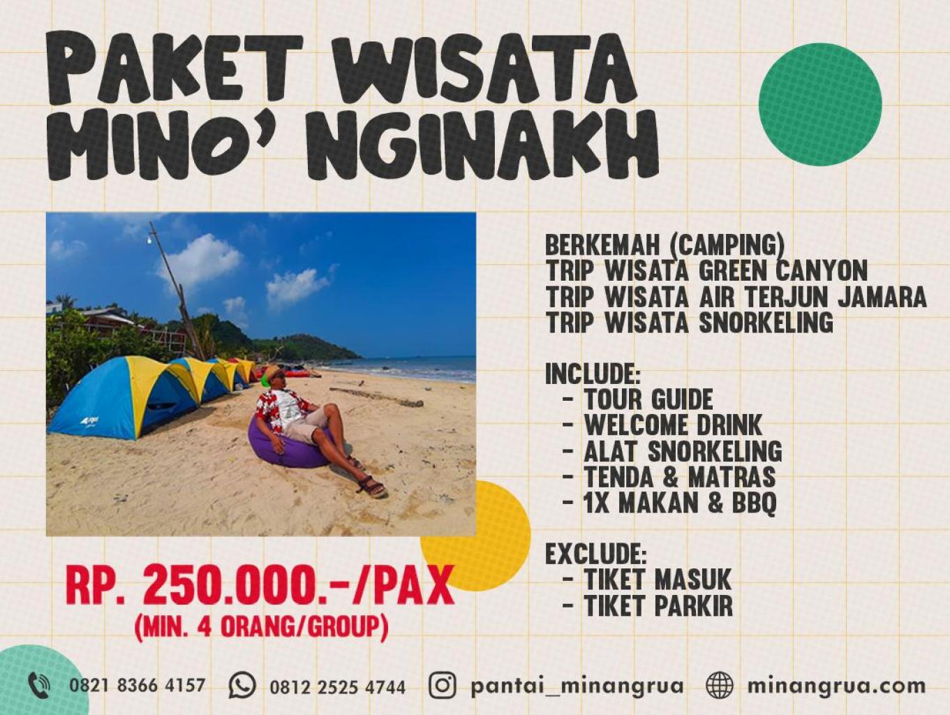Paket Wisata Mino' Nginakh dibuat untuk para wisatawan dengan tujuan sebagai wisata yang memperkenalkan pantai minang rua kepada wisatawan untuk menikmati indahnya malam dengan ditemani semilir angin, dan deburan ombak di tepi pantai dengan menggunakan tenda dan menyalakan api unggun serta diisi dengan kegiatan membakar ikan dan beberapa bahan makanan lain nya yang bisa di bakar seperti jagung, sosis dan lain sebagainya.