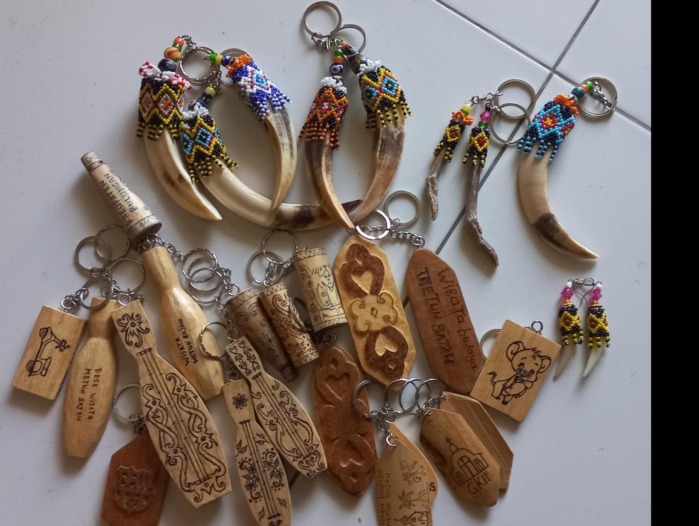 gantungan kunci ini dibuat sendiri dengan kratifitas menggunakan bahan kayu, manik dan gigi hewan (ada yang halal dan non halal). Gantungan Kunci dan Kalung Dayak, Gantungan kunci atau disingkat ganci (Inggris: keychain) adalah gantungan kecil yang digunakan untuk mengaitkan suatu benda kecil dengan lubang kunci.Gantungan kunci biasanya terbuat dari kayu, manik-manik, gigi taring hewan asli dan plastik. Sebuah gantungan kunci juga dapat dihubungkan dengan beberapa gantungan kunci lainnya.Gantungan Kunci dan Kalung Dayak, Gantungan kunci atau disingkat ganci (Inggris: keychain) adalah gantungan kecil yang digunakan untuk mengaitkan suatu benda kecil dengan lubang kunci.Gantungan kunci biasanya terbuat dari kayu, manik-manik, gigi taring hewan asli dan plastik. Sebuah gantungan kunci juga dapat dihubungkan dengan beberapa gantungan kunci lainnya.