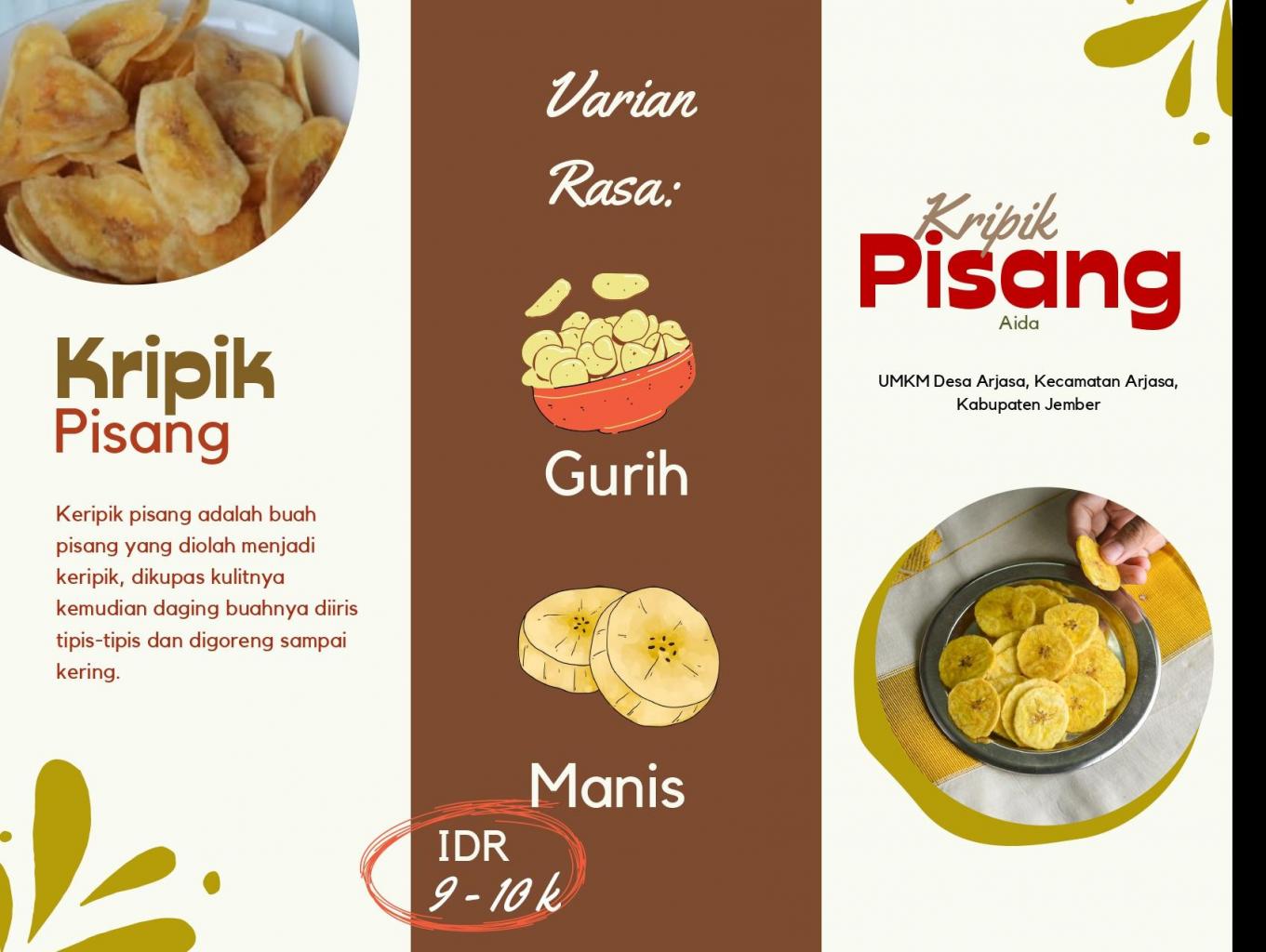 Kripik pisang ini terbuat dari bahan alami yaitu pisang gepok yang mengandung karbohidrat akan tetapi rendah lemak dan kadar gula sehingga cocok menjadi cemilan setiap hari. Ada berbagai macam varian rasa dalam kripik pisang ini.