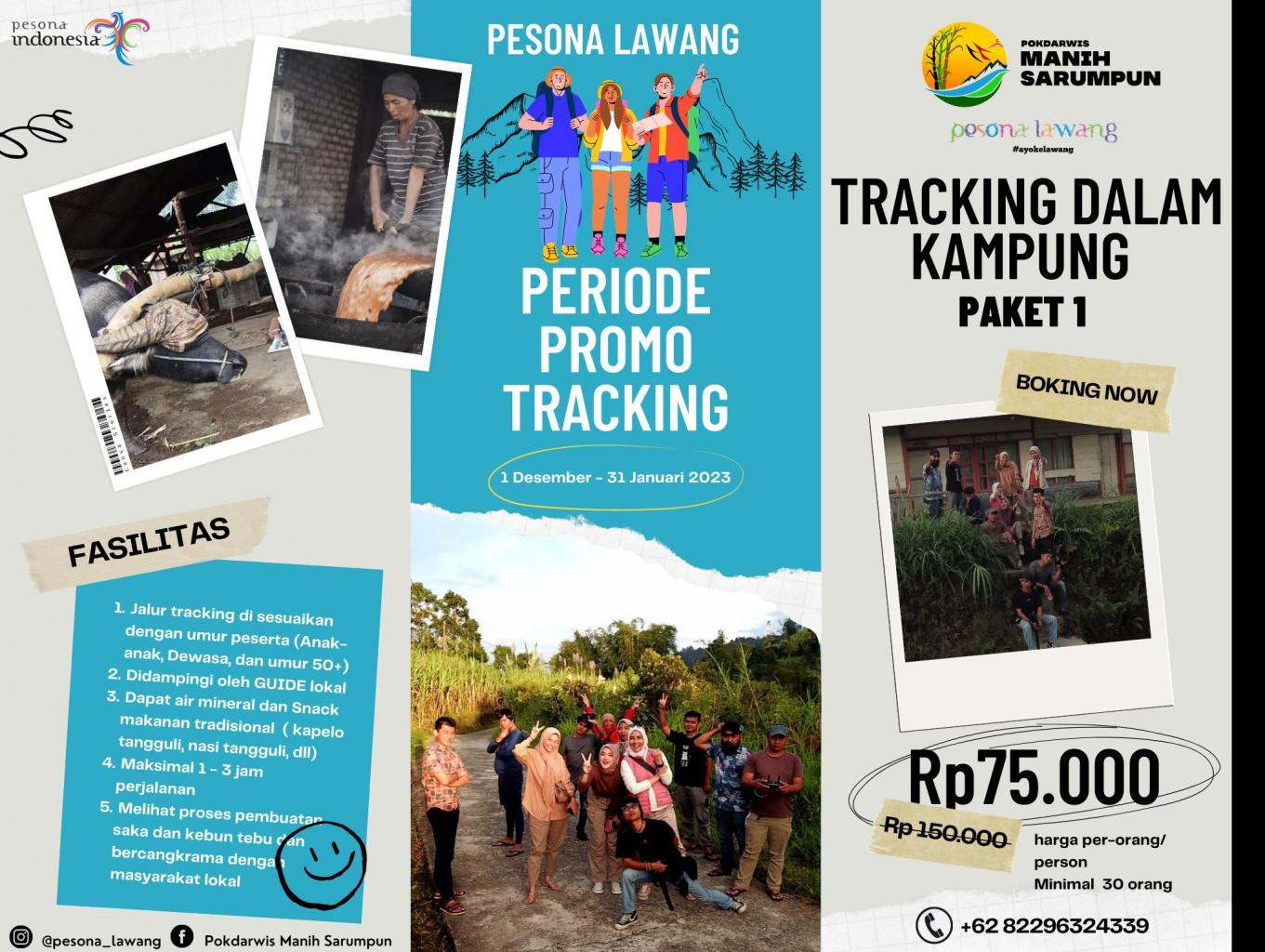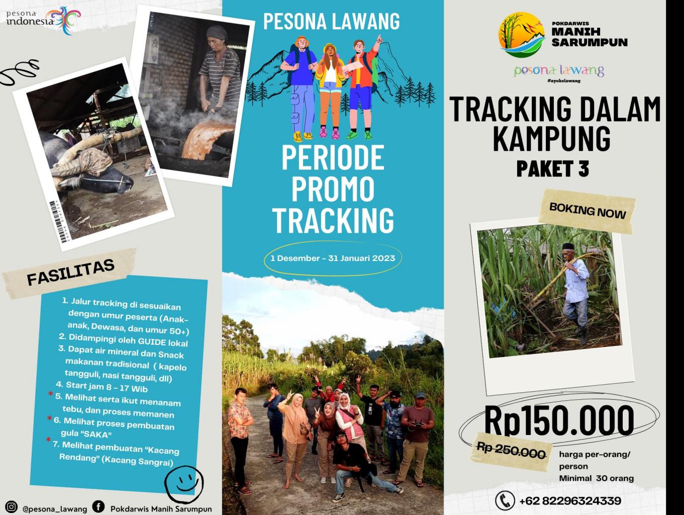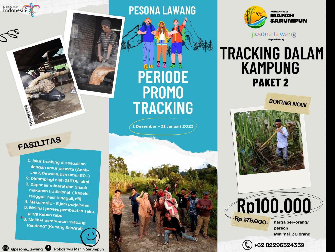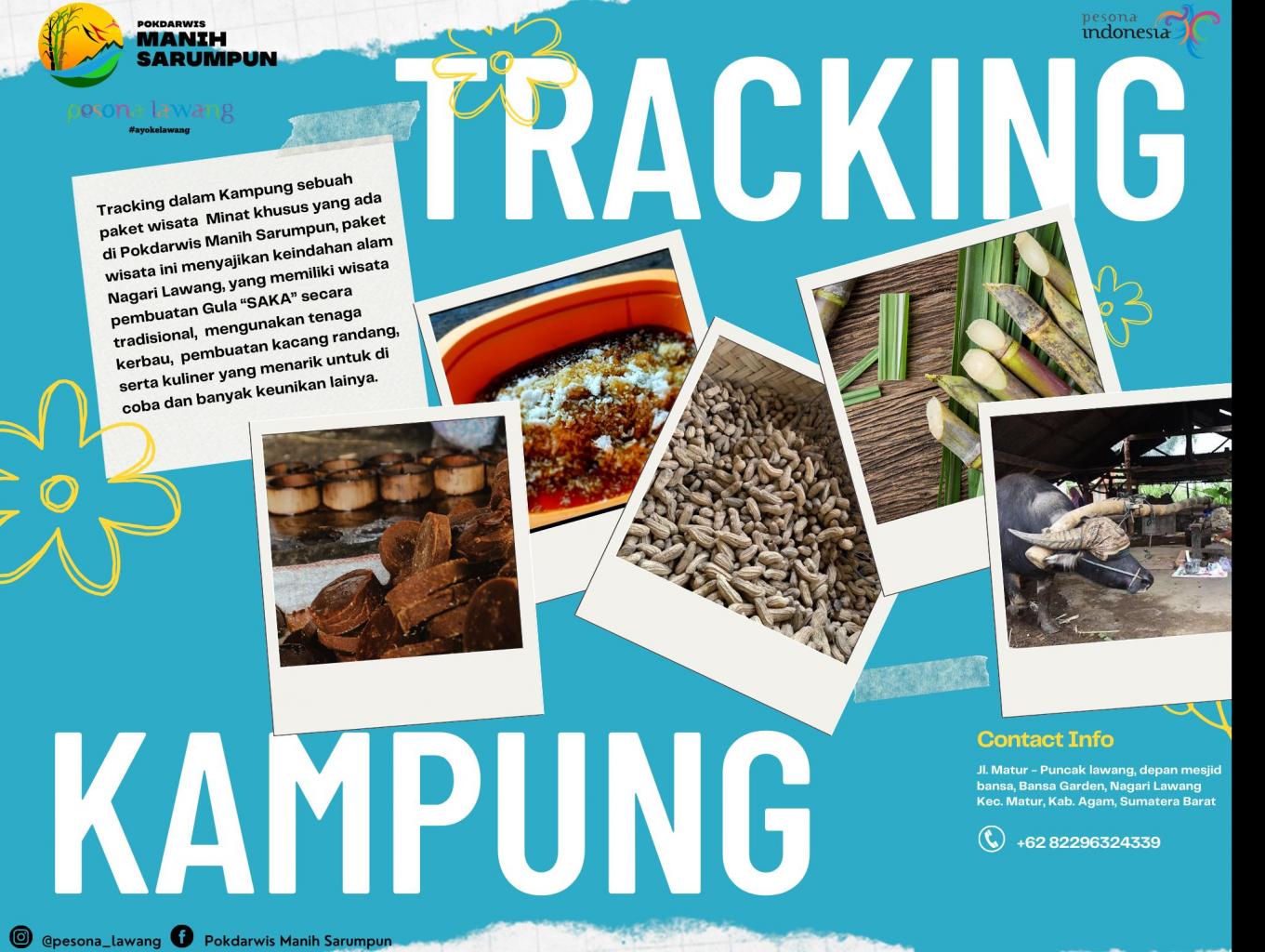 Pesona Lawang ada paket wisata baru loh  “Tracking Dalam Kampung Wisata Lawang” sobat bisa mencobakan atraksi tracking kampung yang di balut perkebunan tebu terbesar di sumbar, pengilangan tebu sampai dengan proses jadinya gula “SAKA” di pandu oleh Guide lokal berpengalaman dan menikmati kuliner tradisional khas Lawang seperti :
