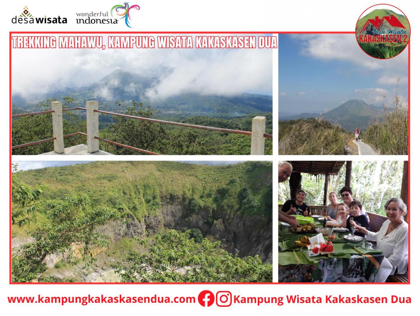 Pagi hari peserta dijemput di Homestay / Cotage / Hotel di Kakaskasen Dua dengan Ojek masyarakat setempat untuk memulai Trekking Gunung Mahawu lewat Kakaskasen Dua. Sebelum trekking peserta akan diajak ke Batu Kadera dan Gua. Selanjutnya dengan pemandu lokal tamu di pandu untuk Trekking ke Hunung Lokon dan menikmati indahnya pemandangan kota Tomohon, Tondano dan Manado. Setelah berfoto foto peserta di ajak turun untuk makan siang di Kebun Penduduk dengan menu traditional Minahasa (Halal). Setelah itu peserta kembali dengan menggunakan Ojek Lokal.